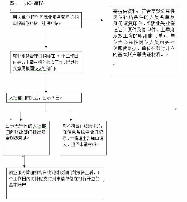 受理用人單位申報公益性崗位補貼、社保補貼資料,審核、撥付公益性崗位補貼、社保補貼。